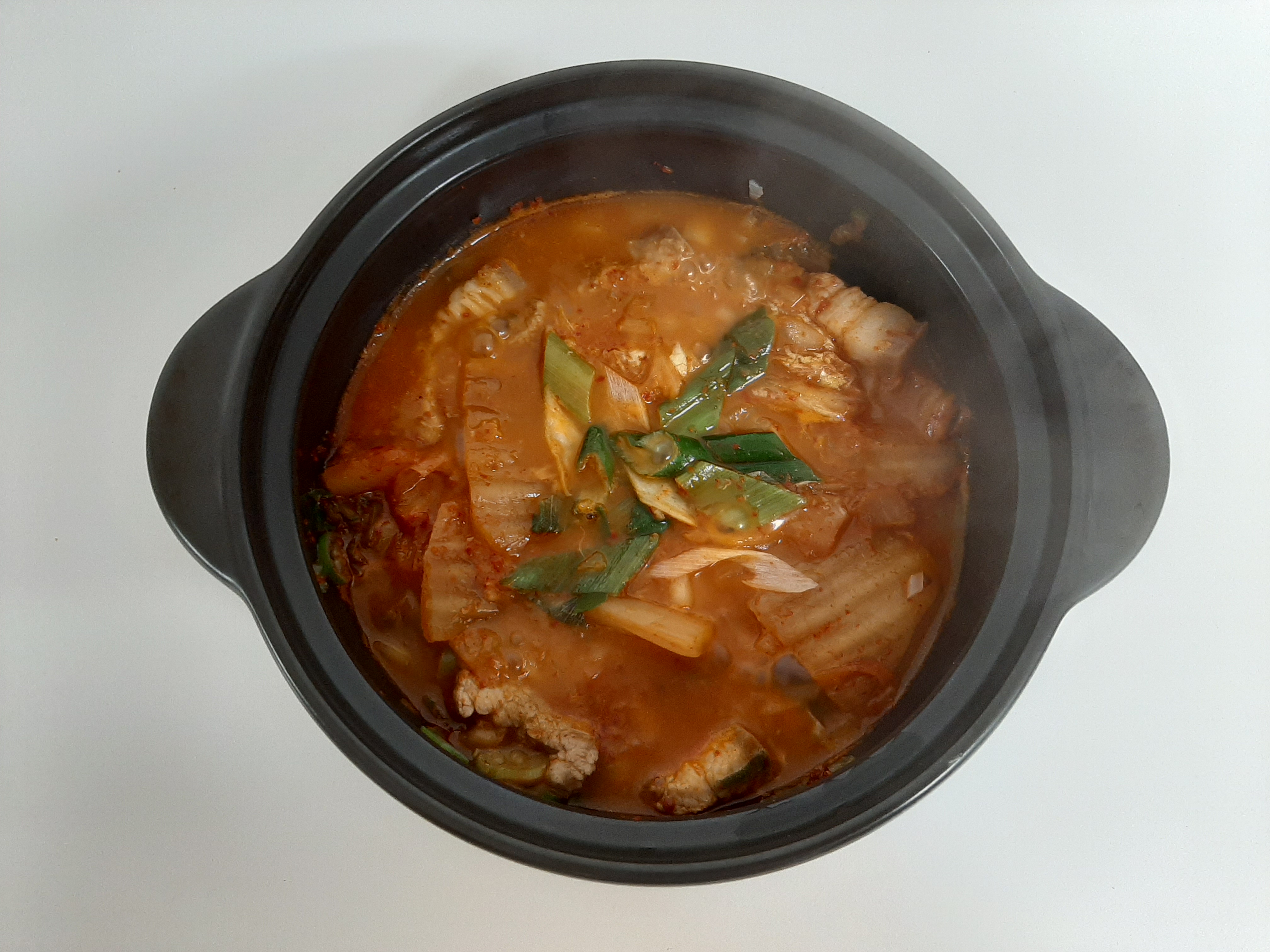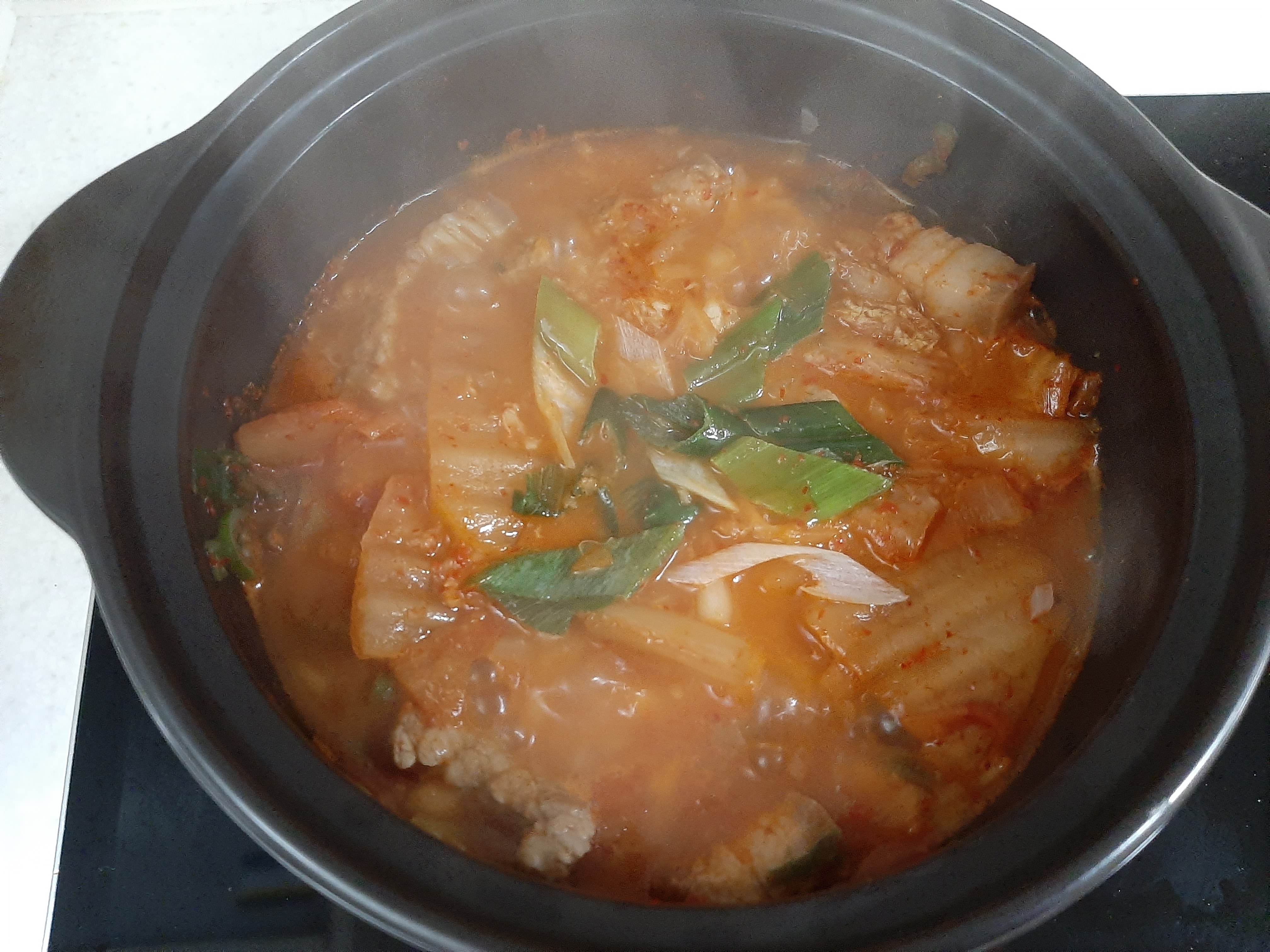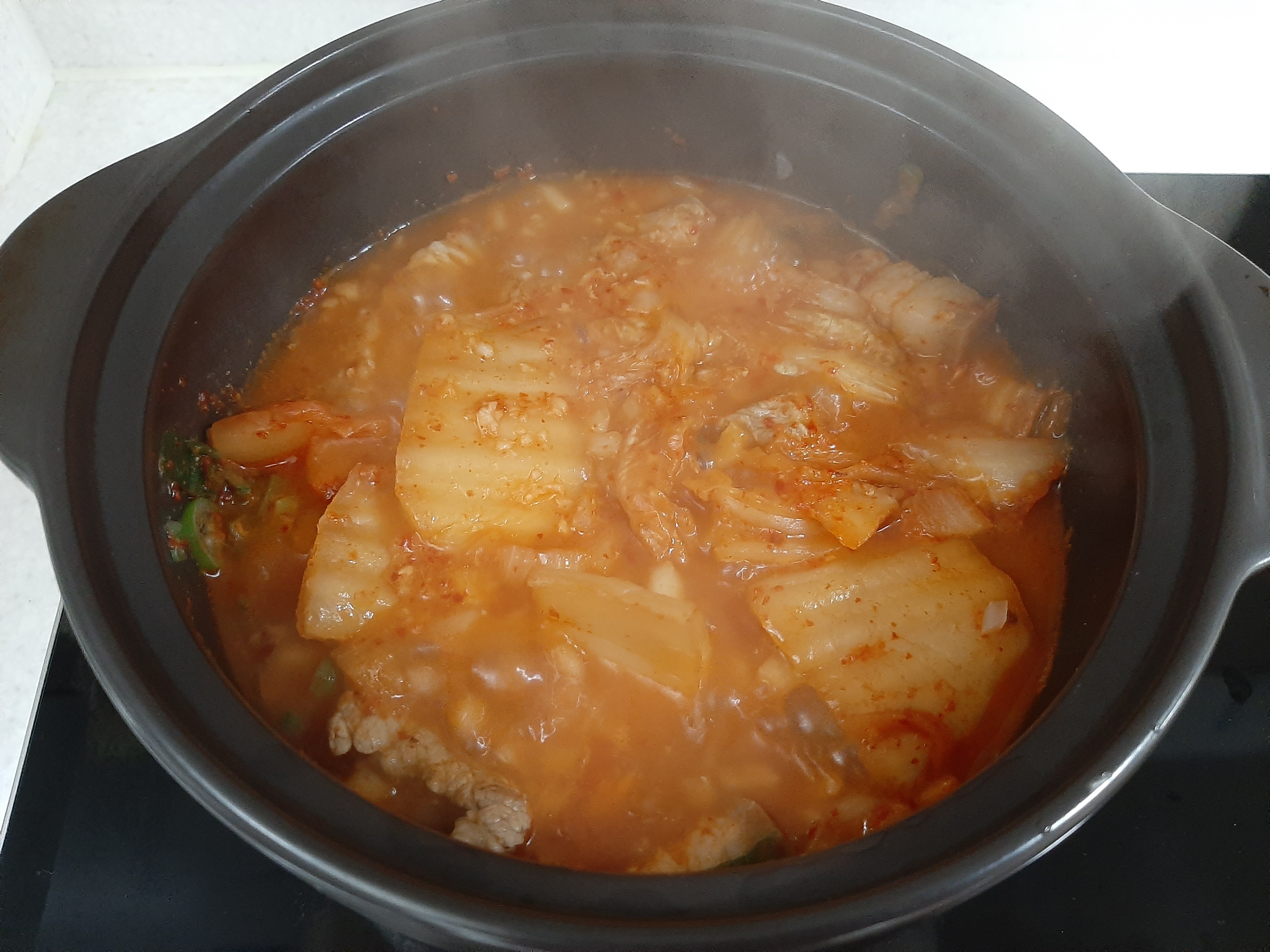 국물을 계속 졸이다가 불을 껐을 때, 고기와 김치와 같은 재료들이 반정도만 잠겨 위에서 보인다면 적당하게 졸여진 것이라고 합니다. 그런데 저는 뚝배기에 끓여서 그런지 덜 졸여졌는데 제 취향에는 국물이 좀 있는게 좋아서 더 끓이지 않았어요. 취향껏 하시면 될듯해요.