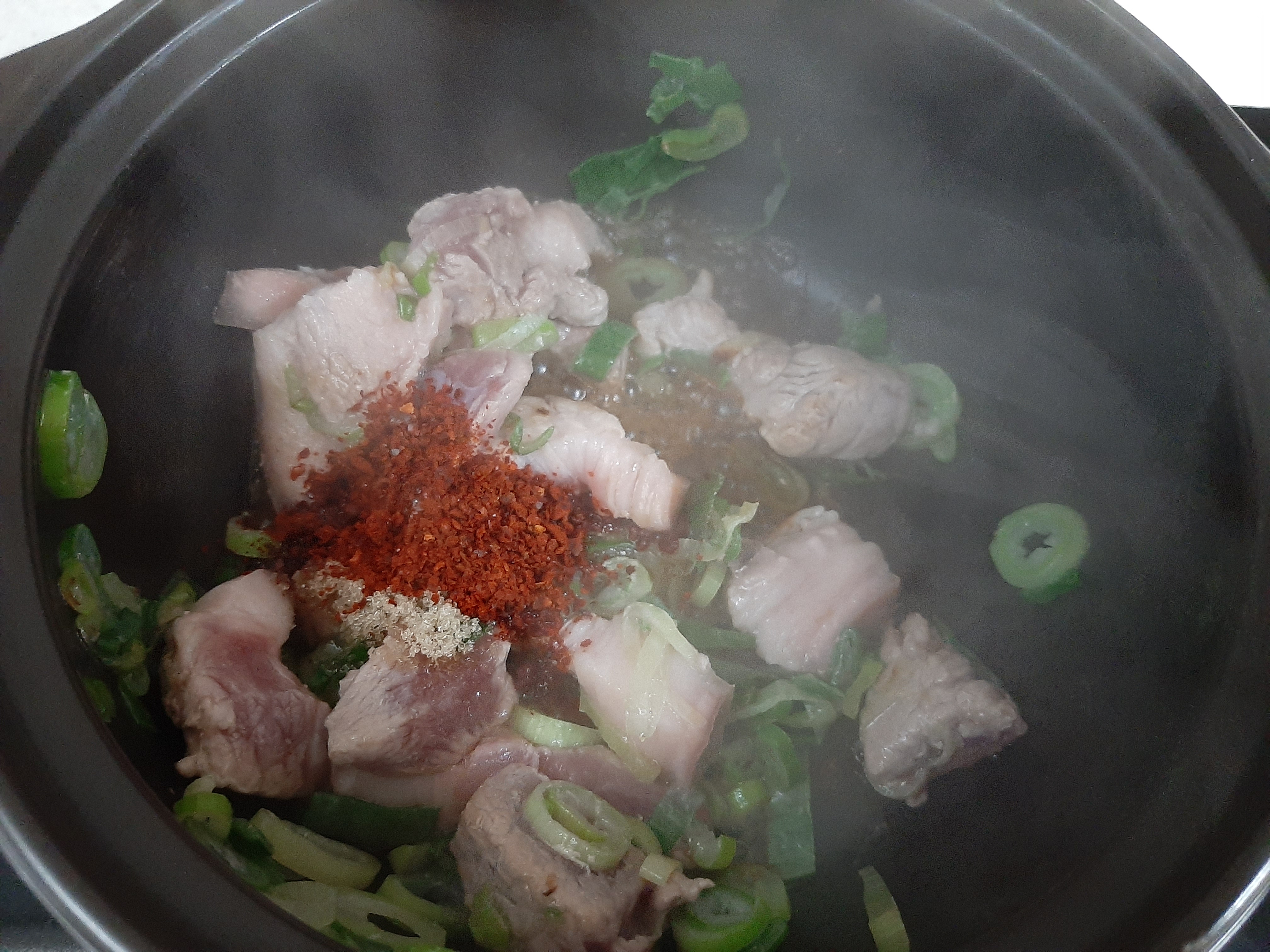 9. 다진마늘 1T를 넣고 국물전체에 잘 풀어줍니다.