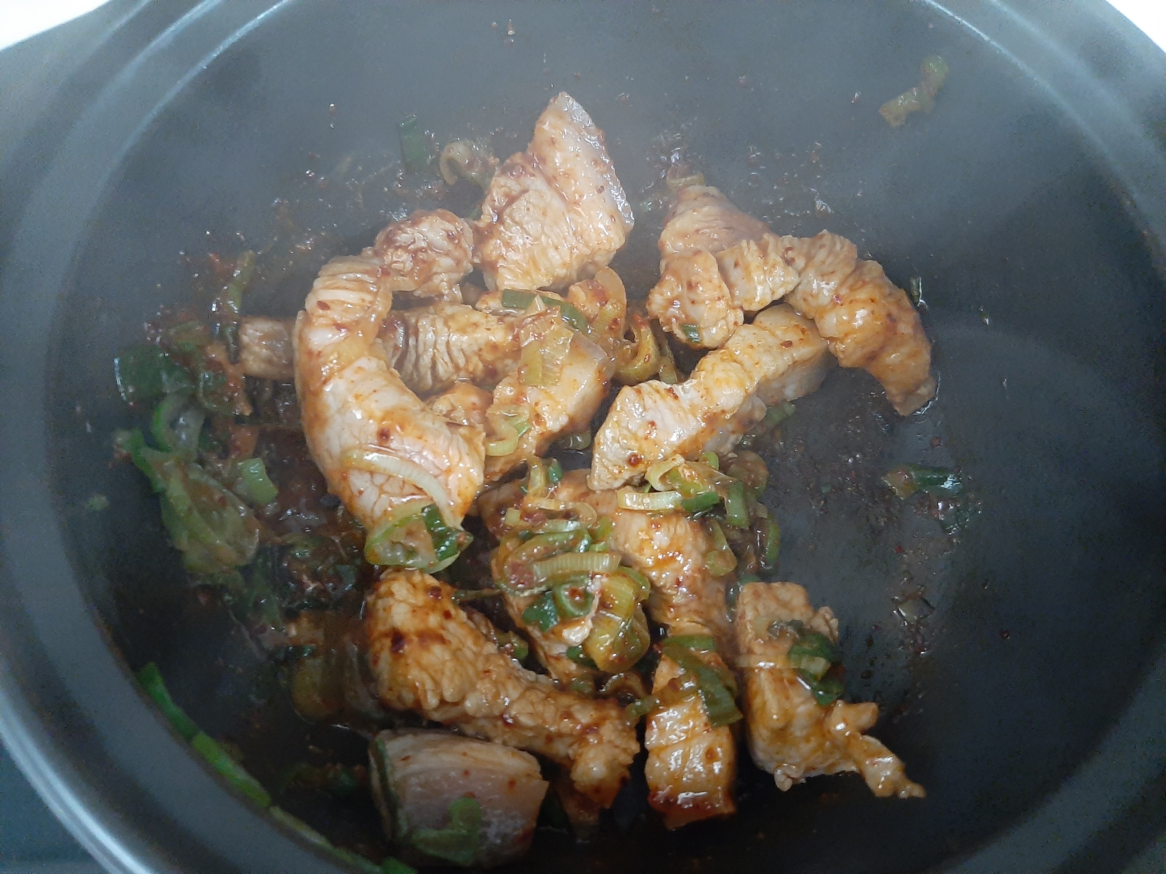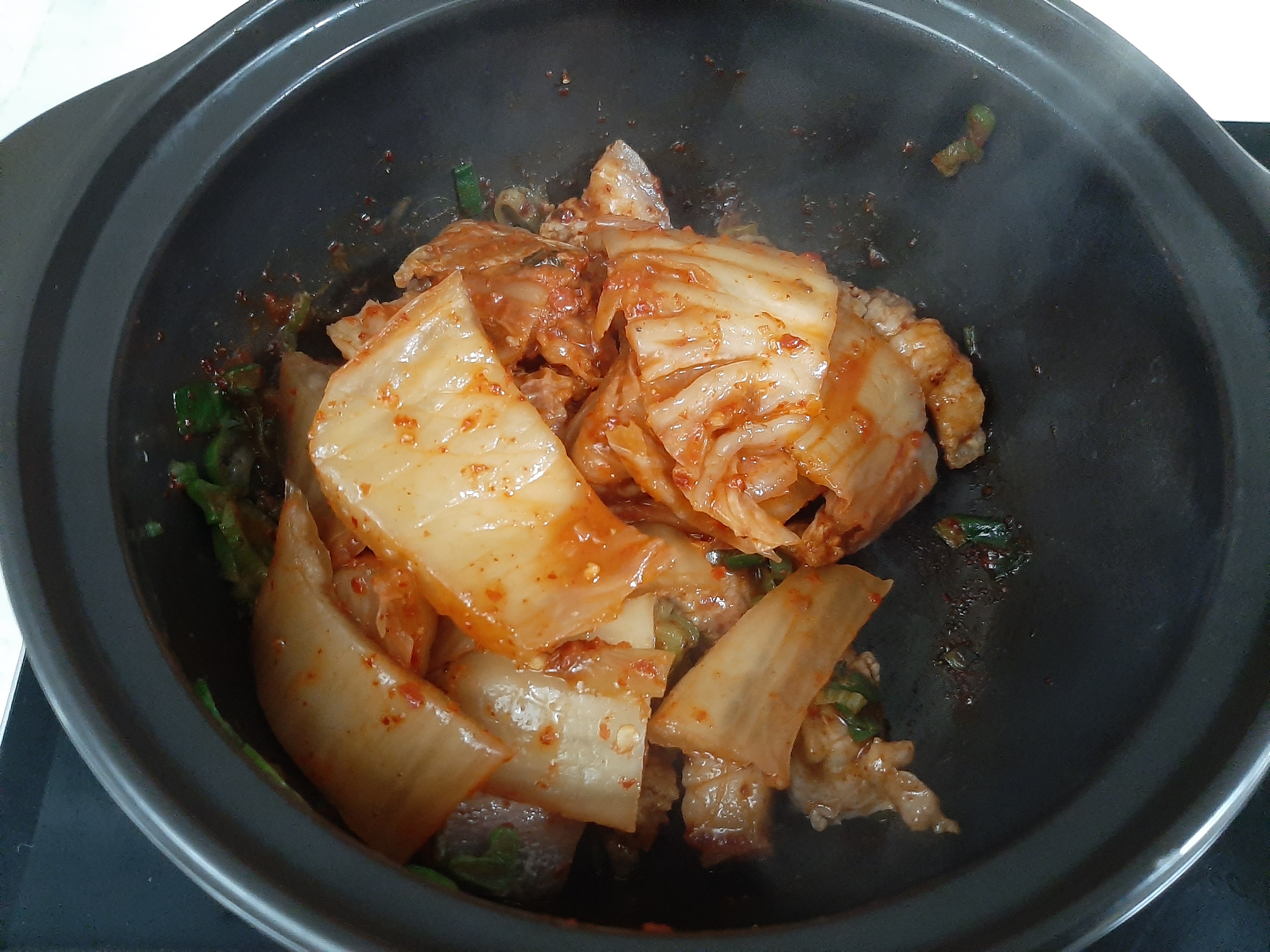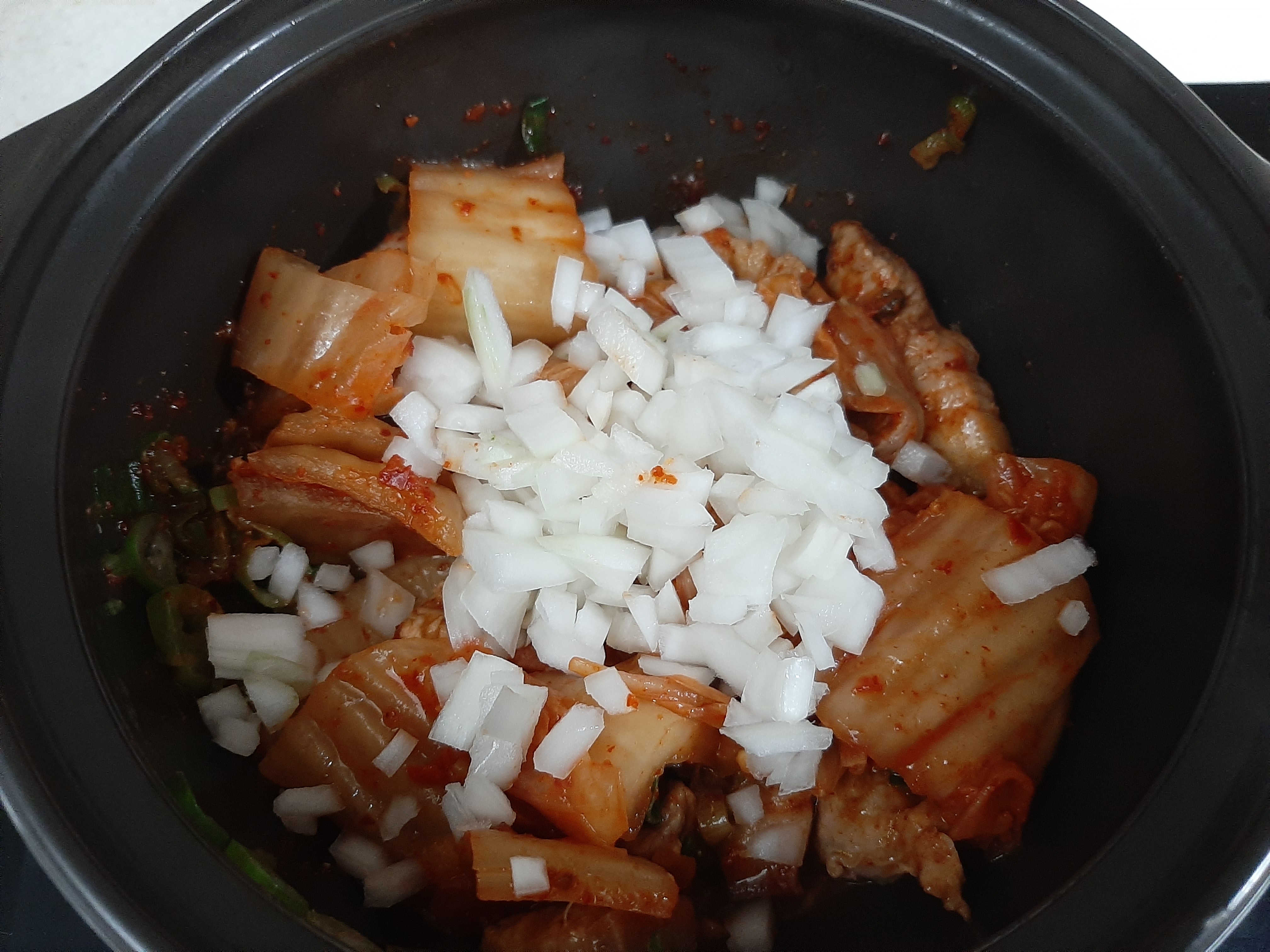 식용유 1T, 썬 대파 1컵(종이컵기준), 돼지고기(삼겹살이나 앞다리살-어느정도 지방이 있어야 더 맛남)200g, 설탕 1/2T, 고춧가루1T, 국간장2T, 김치200g(고기와 동량), 김치국물 4T, 양파 1/4개, 다진마늘 1T, 물 종이컵1컵, 토핑용 대파 1T