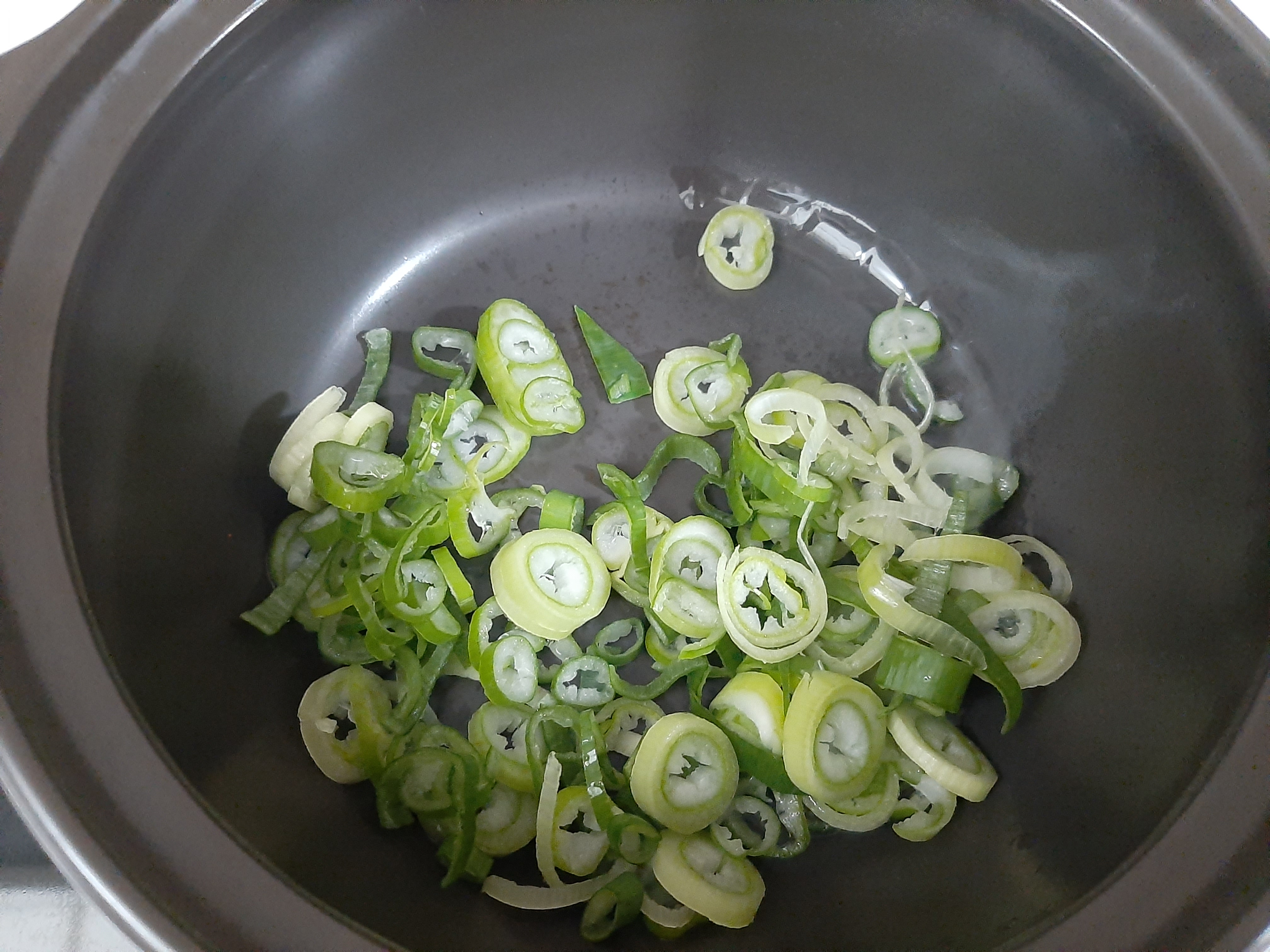 3. 썰어놓은 대파 1컵을 부어서 약한불에서 저으며 파기름을 내줍니다.