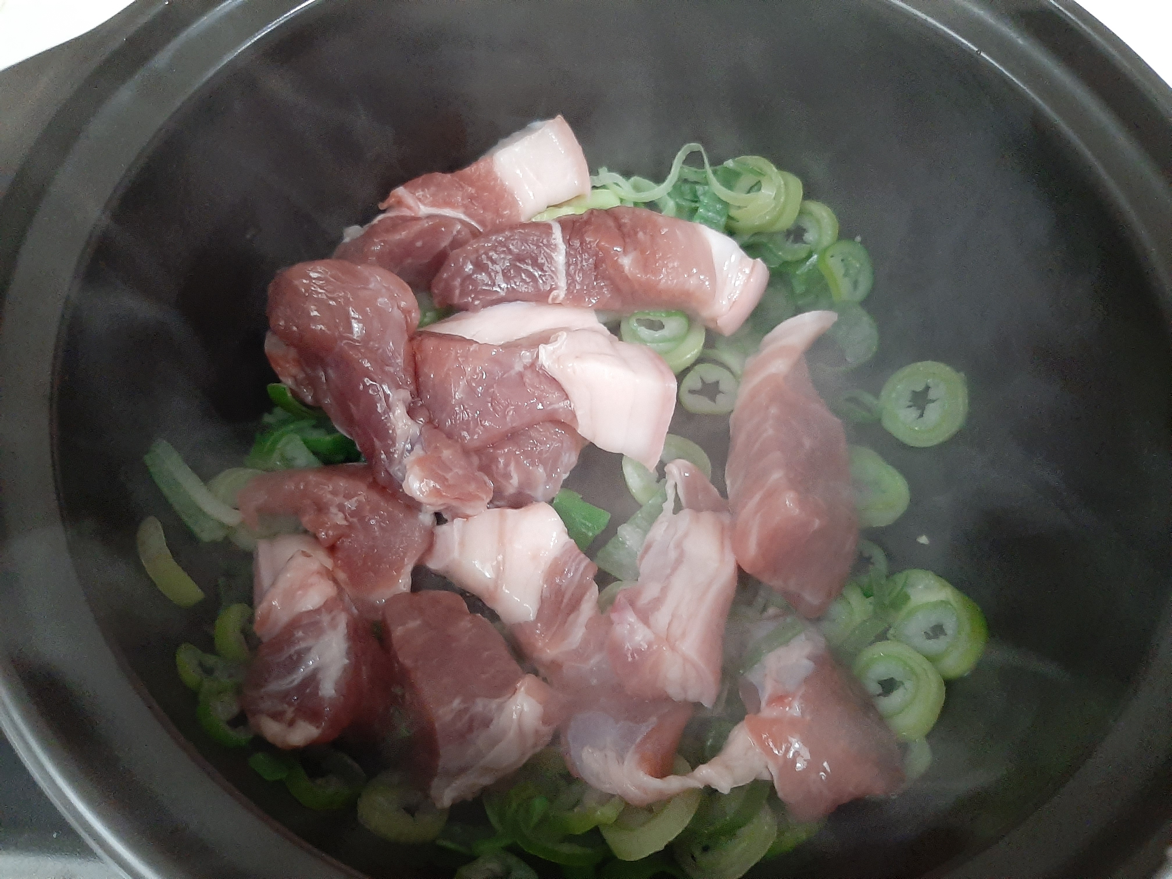 4. 돼지고기 200g을 넣고 겉면의 핏기가 가실정도로 살짝 볶아줍니다. (전 150g밖에 없어서 그것만 넣었어요.)