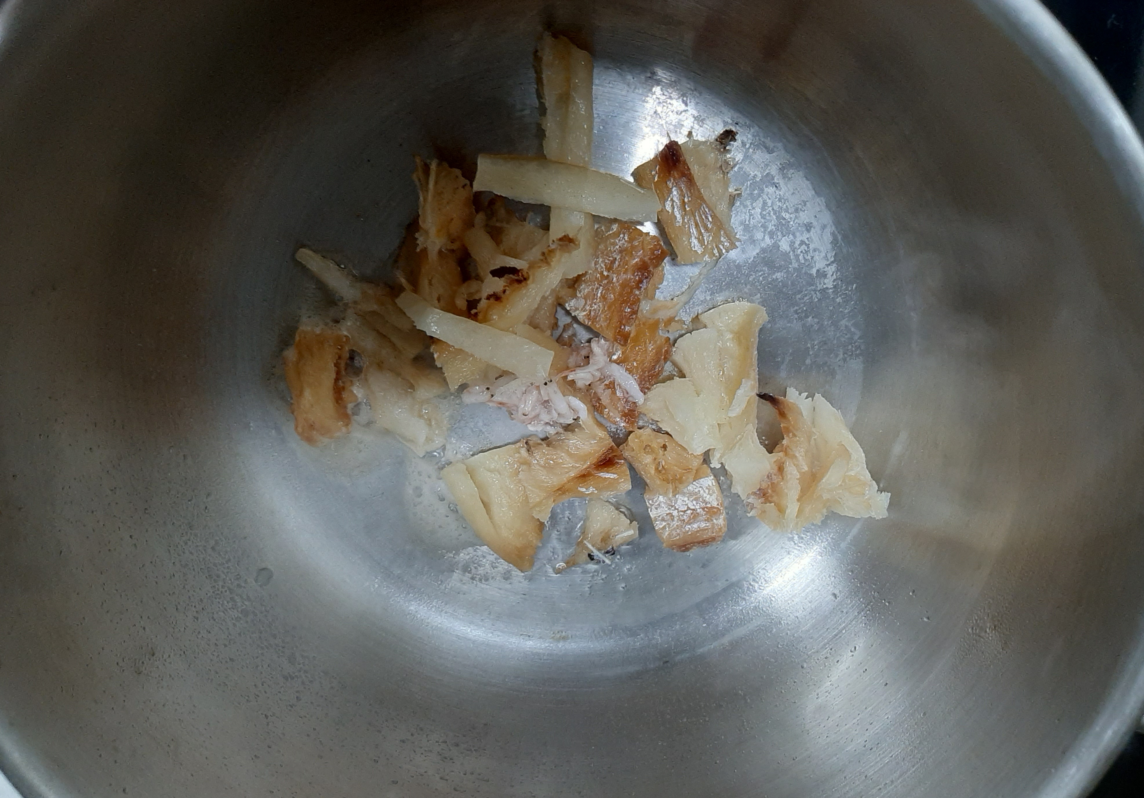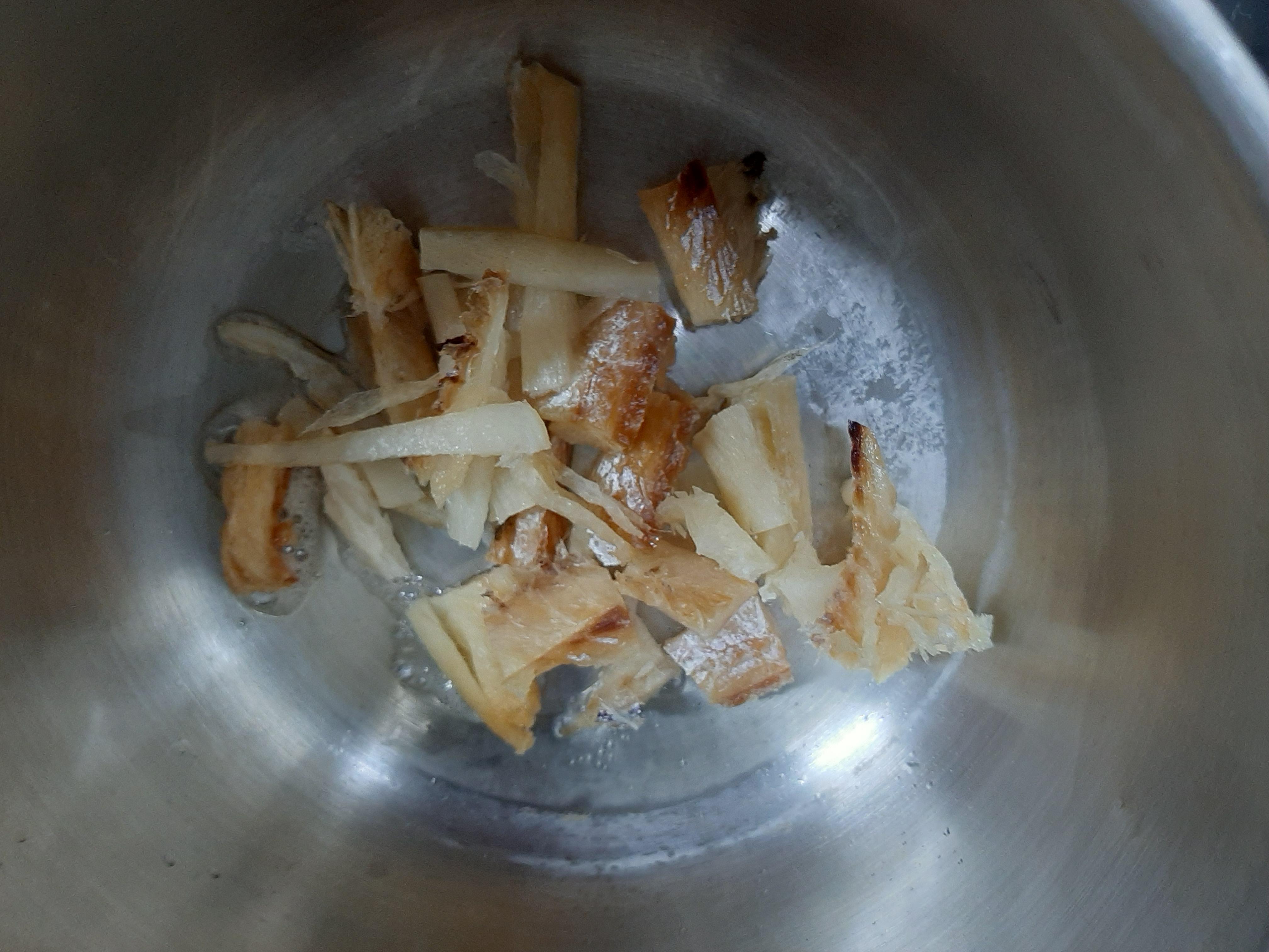 4. 황태채 위로 새우젓 1T를 넣고 마저 볶아줍니다.