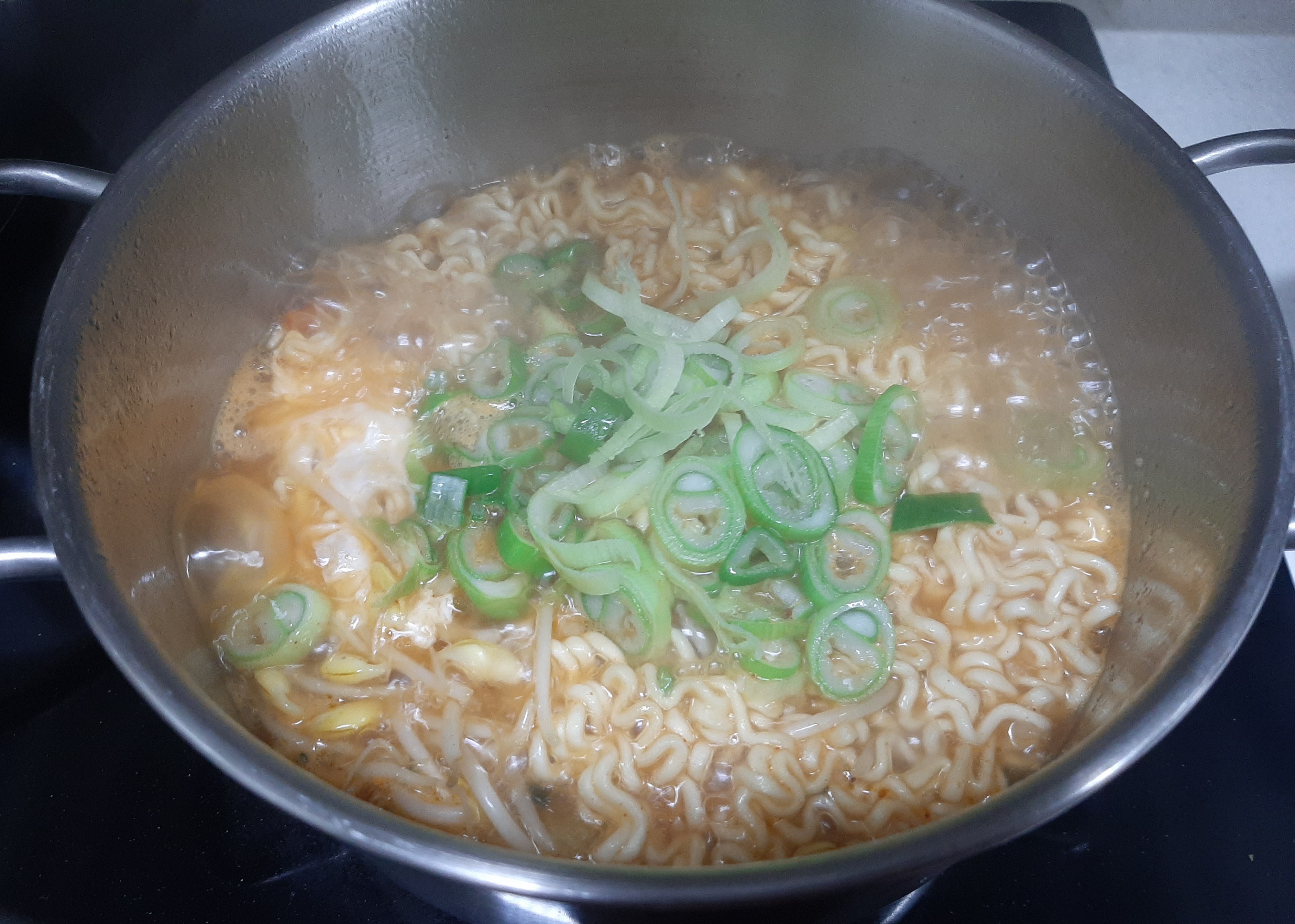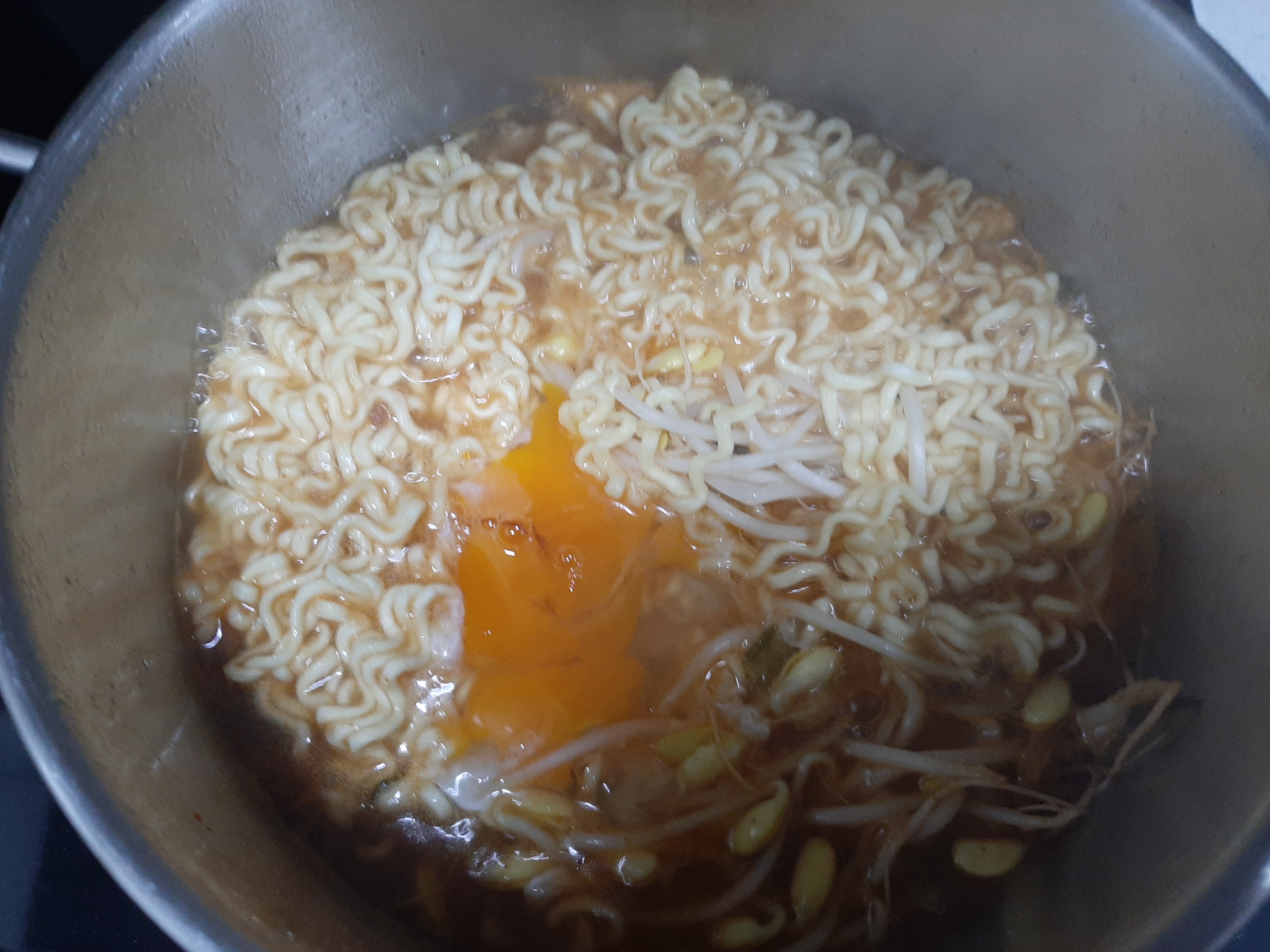 9. 면이 살짝 익을때쯤 계란도 하나 풀어서 넣어줍니다.