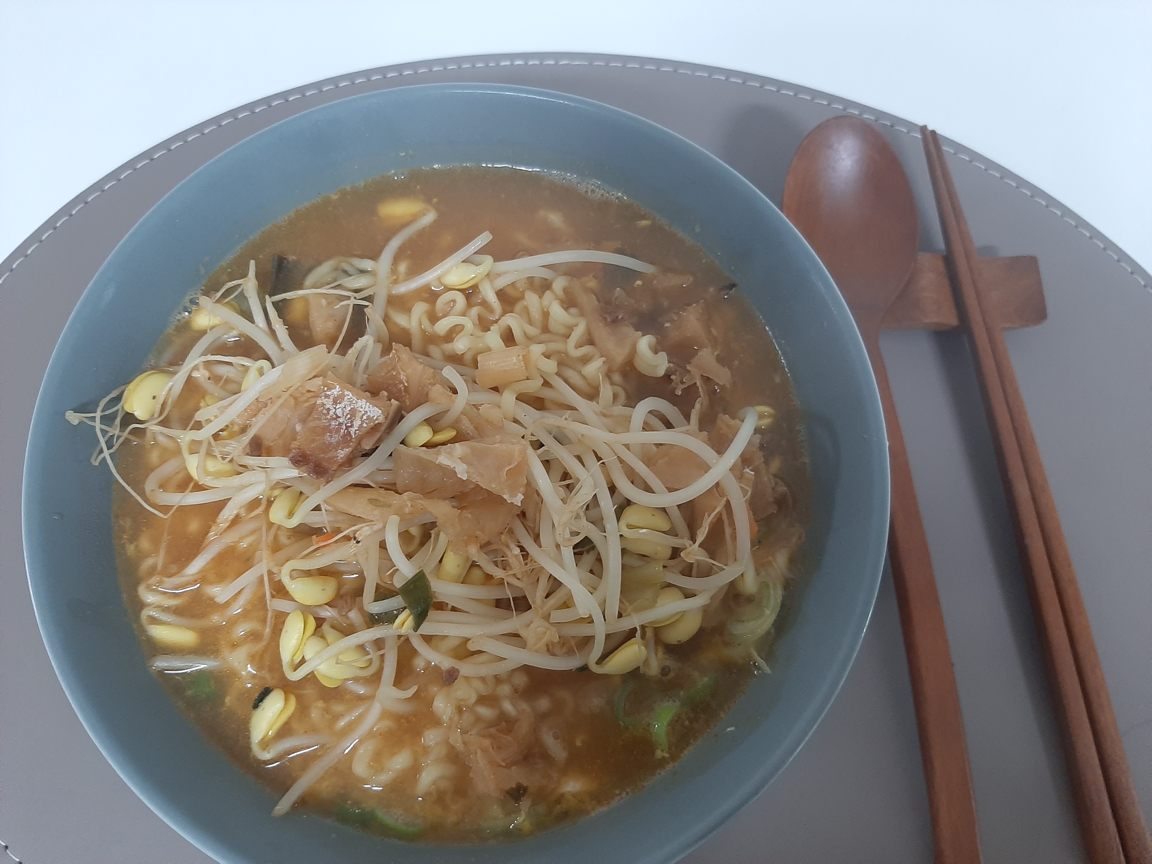 라면을 그릇에 옮겨놓으니 완성입니다. 콩나물과 황태가 라면 위쪽으로 얹어져 보기만 해도 시원할것 같은데요, 맛보니 예상대로 시원하고 맛있더라구요. 면도 많이 퍼지지 않게 잘 끓여져서 너무 맛있었답니다. (오늘 사진은 다 뿌옇게 나와서 사진에 맛있는 느낌이 덜 담긴것 같아요.😅)